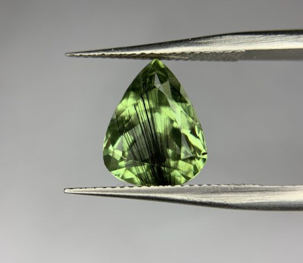 Unlike typical peridots, this piece boasts an aesthetic inclusion pattern prized by gem collectors and mineral enthusiasts. Ludwigite, a rare black mineral, appears as slender needle-like inclusions, giving this gem a mesmerizing, almost galaxy-like appearance under magnification.